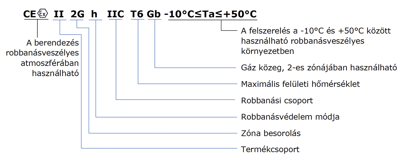 A jelölésben szereplő zóna besorolás, illetve a robbanásbiztos légtér, a jelölés végére még egyszer bekerül az alábbi formában: