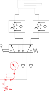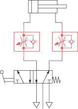 Alkalmazási példa: A fenti példánál maradva, a munkahenger sebességét fojtó-visszacsapó szelepekkel állítjuk be, ahol mindig a munkahengerből távozó levegőt fojtjuk.