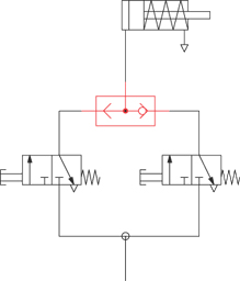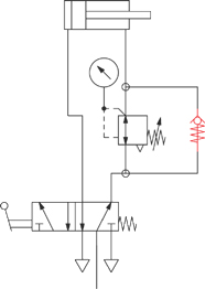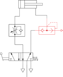 Alkalmazási példa: a kettősműködésű munkahenger alaphelyzetbe állításához - levegőtakarékossági szempontokat figyelembe véve - nincs szükség akkora nyomásra, mint amekkora a munkahengert véghelyzetbe működteti. Az alaphelyzetbe állításhoz kisebb nyomást állítunk be a nyomásszabályzón, mint a rendszernyomás. A visszacsapó szelep biztosítja, hogy a munkahenger mínusz kamrájából a levegő szabadon átáramolhasson, és a szelepen kipufogjon, amikor a munkahenger véghelyzetbe áll. Azonban a visszacsapó szelep visszafelé már zárja az áramló közeg útját, és csak a nyomásszabályzó szelepen keresztül tud áramolni a sűrített levegő.