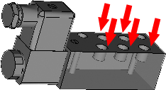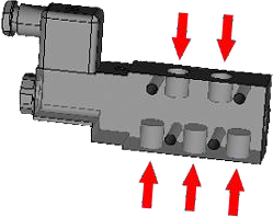 A szeleptesten lévő pneumatikus csatlakozások elhelyezkedésére utal:
