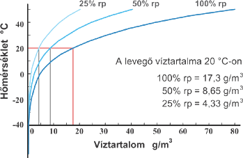 (A levegő maximális nedvességtartalma 20 °C-on 17,3 g/m3, amelynek az értéke nomogramból olvasható. 60 %-os páratartalom mellett = 17,3 x 60 / 100 = 10,38 g/m3 . 10 m3 környezeti levegő esetén = 103,8 g vizet tartalmaz.)