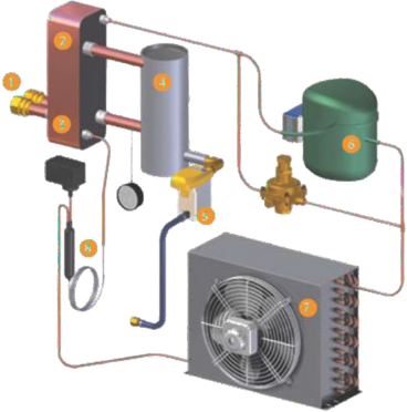 - hűtőközeg- cseppfolyósító (léghűtéses)